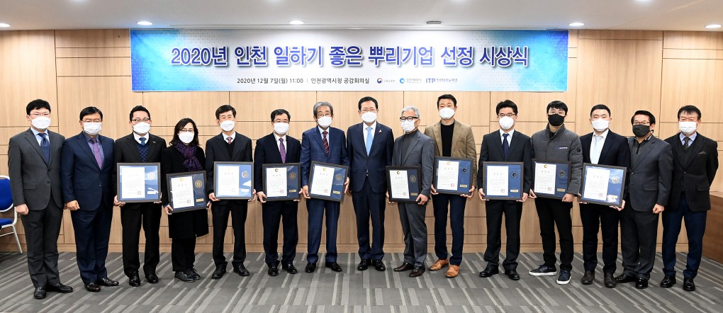 인천시는 7일 오전 시청 본관 2층 공감회의실에서 2020년 인천 일하기 좋은 뿌리기업 선정 시상식을 열었다고 밝혔다.