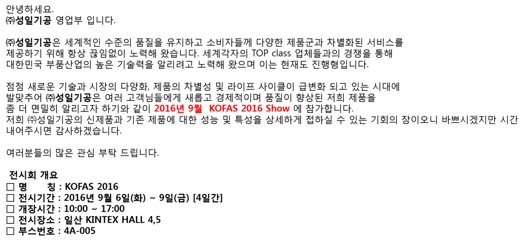 9월6-9일 KOFAS (2016 국제자동화 정밀기기전)에 참석합니다