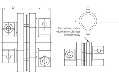 - Place a dial gauge right on the surface which is machined with the inner diameter simultaneously (see figure), and fasten the screws alternately observing the gauge variation (run-out) is less than 0.02.
