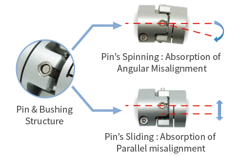- SCJ series is excellent for absorbing both angular/parallel misalignment through middle pin/bushing structure and minimizes reaction force on the shaft. (This coupling combines strong features of SOH series coupling and universal joint.)