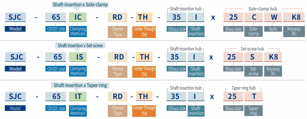 - Various types of coupling hubs (e.g. Side-clamp, Set-screw) can be combined