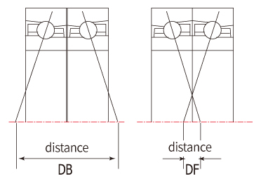 - DF combination (face to face): The small distance between effective load centers limits bearing capacity to sustain moment load, however it performs at a better level to absorb the margin of assembly error. Preload is determined at maker’s assembly of bearing cover, thus this way allows easier self-management for users.