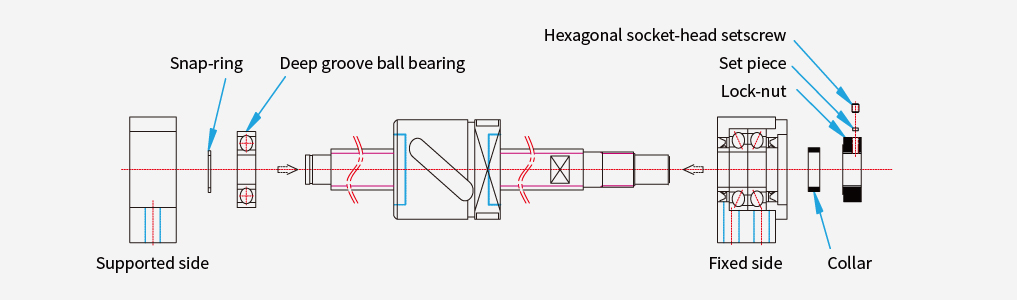 2. Mount the deep groove ball bearing (of supported side support unit) onto the ball screw shaft-end, and fix with a snap-ring to secure and then insert the assembly to the housing of supported side support unit.