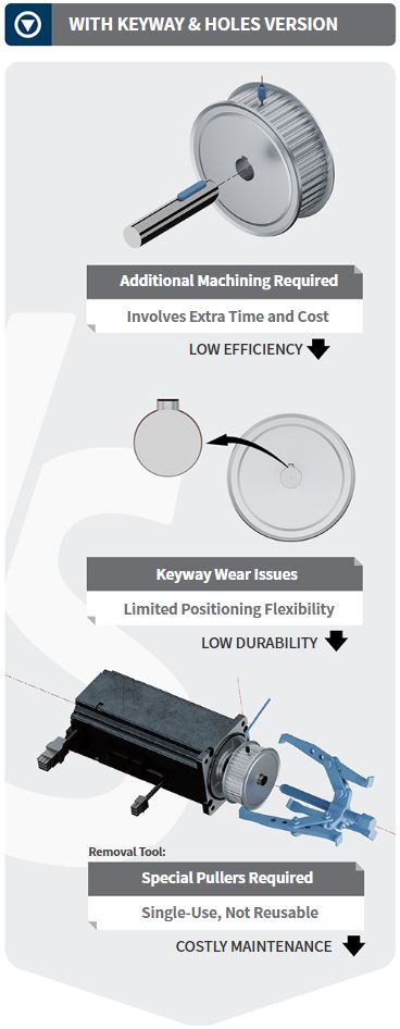 sufficient tightening force without additional processing on shafts / pulleys, etc.