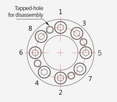 - 5.1 Fasten the screws with identical torque (1/8 of fastening torque) using torque wrench.