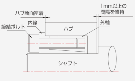 - シャフト段加工部位とハブの間に必ず1mm以上の間隔をあけて下さい。(間隔がないと解体が難しく、本体フランジ部分変形の原因となります。)