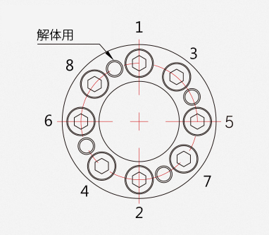 - トルクレンチを使用して同じトルク(締付トルクの⅛)でボルトを締めます。