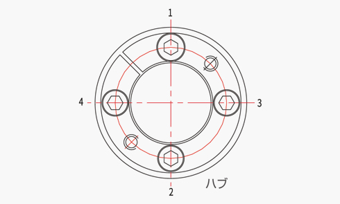 - 二次締結時は、締付トルクの½の力で締めます。(対角線に順次締結)