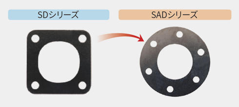 SADシリーズは、従来の一般ディスクタイプ(SDシリーズ)の板バネ形状を改善して強度と剛 性を向上させた製品です。従来の2点固定方式(SDシリーズ)から3点固定方式(SADシリー ズ)へ変更して耐久性を高めることで、性能レベルを落とすことなくより小さなサイズの製品 を使えるようになりました。
