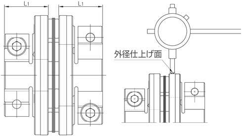 4. 外径仕上げ面にダイヤルゲージを当て、軸を回転させた際にゲージの振幅量が0.02以下になるよう調整しながら締結ボルトを交互に締め付けて下さい。
