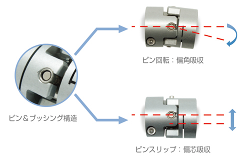 - クロスジョイントカップリングは中央部のピン/ブッシング構造により非整列を吸収する機能を持ち、ミスアライメント発生時に軸とシステムに伝達する偏芯反力を最小限に抑えます。(オルダムカップリングとユニバーサルジョイントの特徴を組合せたカップリングです。)