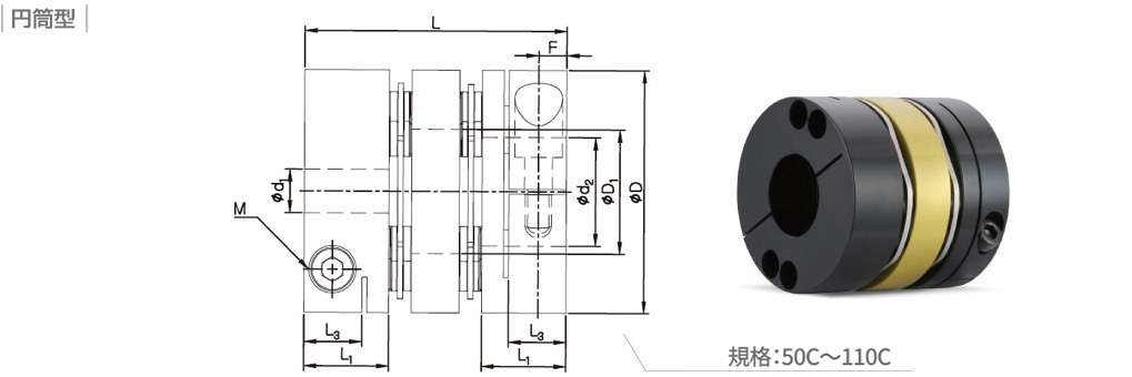 - ★表示のある内径は、カップリング内の部品と干渉するため軸を貫通させられません。必ず軸をL1寸法まで挿入して使用して下さい。 軸貫通使用の可否は非整列(ミスアライメント)を考慮しておりません。