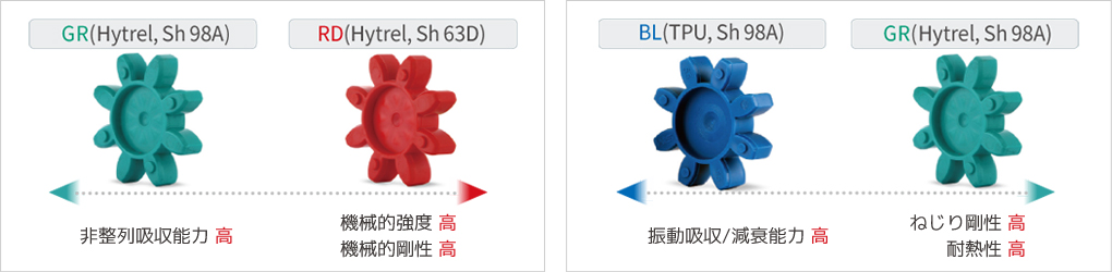 - スリーブの種類は、材質の強度によって RD(Hytrel, Sh63D)とGR(Hytrel, Sh98A)、そしてBL(TPU, Sh98A)に分かれます。