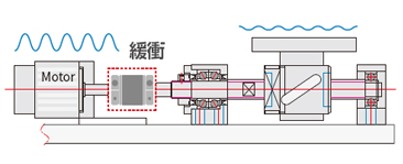 装備駆動時に発生する振動や衝撃がモーターや減速機、ボールねじに直接伝わると機械性能に悪影響を与え、部品保守が必要となる場合があります。カップリングはこのような衝撃や振動を吸収する役割を果たします。リジッドタイプカップリングを除くすべての機種にこの機能がありますが、カップリング中央部に、緩衝的役割を持つプラスチック材質の部品を使用しているカップリングは比較的吸収能力に優れています。