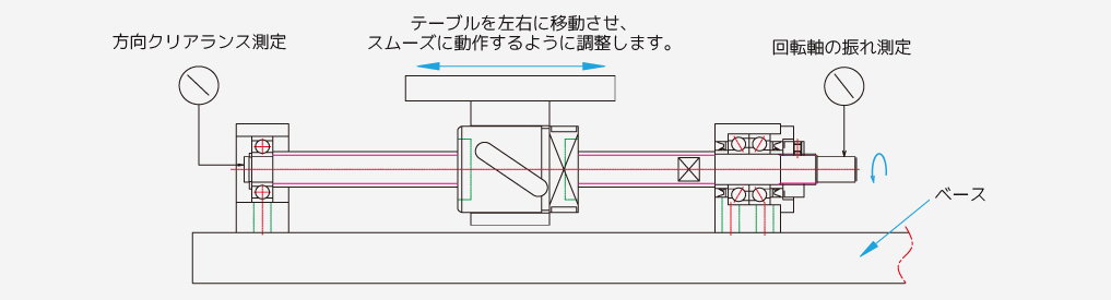 2. ボールねじの回転軸先端の振れと軸方向のエンドプレイはダイヤルゲージを用いて測定する。測定しながらナットブラケットとテーブル、固定側ユニットとベース、支持側ユニットとベースの順に締結する。