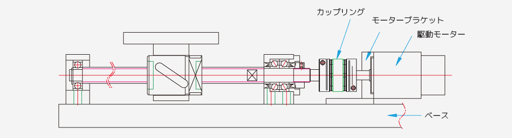 1. モーターに装着したブラケットをボールねじの軸中心と一致するようベースに正確に組立てる。