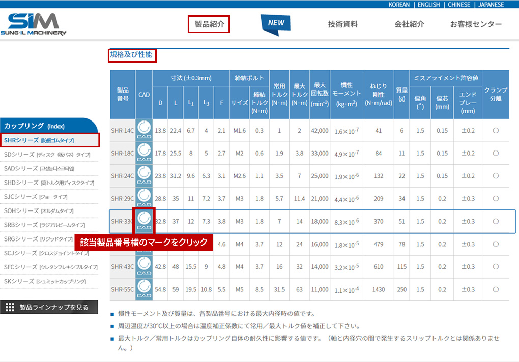 弊社WEBサイト上段メニュー:[製品紹介] >> [カップリング] >> [SHRシリーズ] >> [規格/性能/ CAD]