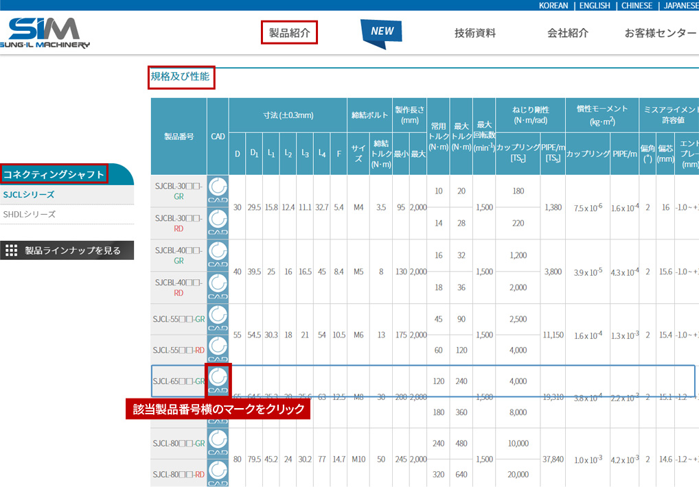 弊社WEBサイト上段メニュー:[製品紹介] >> [コネクティングシャフト] >> [SJCLシリーズまたはSHDLシリーズ] >> [規格/性能/ CAD]