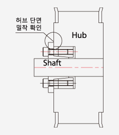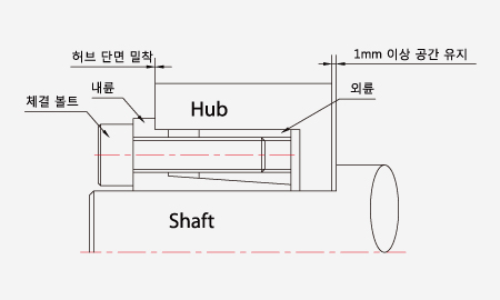 - 샤프트 단가공 부위와 허브 사이에 반드시 1mm 이상의 간격을 두십시오. (간격을 두고 조립하지 않을 경우 해체가 어려우며, 본체 Flange 부분의 변형의 원인이 됩니다.)