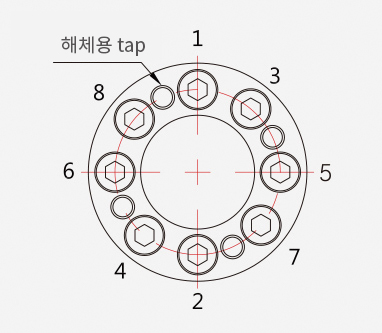 - 토크 렌치를 사용하여 동일한 토크(체결토크의 ⅛)로 볼트를 조입니다.