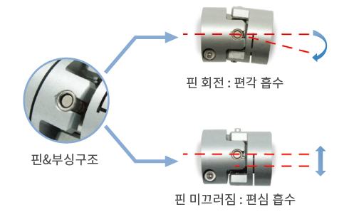- 크로스 조인트 커플링은 중앙부의 핀/부싱 구조로 비정렬을 흡수하는 기능을 가지며 미스얼라인먼트 발생시 축과 시스템에 전하는 편심반력을 최소화 합니다. (올댐커플링과 유니버셜조인트의 특징을 결합한 커플링입니다.)