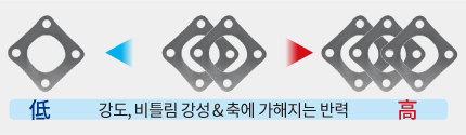 - 표준품 이외에도 판스프링 모듈을 구성하는 스테인리스 스틸 플레이트의 수량을 늘릴 수 있으며 수량 증가에 따른 효과는 우측 그림과 같습니다.