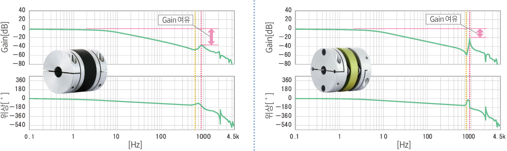 Bode Plot 상 -180 deg 에서의 Gain 여유가 디스크 커플링에 비해 방진고무 커플링 (SHR Series)이 높으므로, 그 차이만큼 Gain 값 상향 조정이 가능합니다.