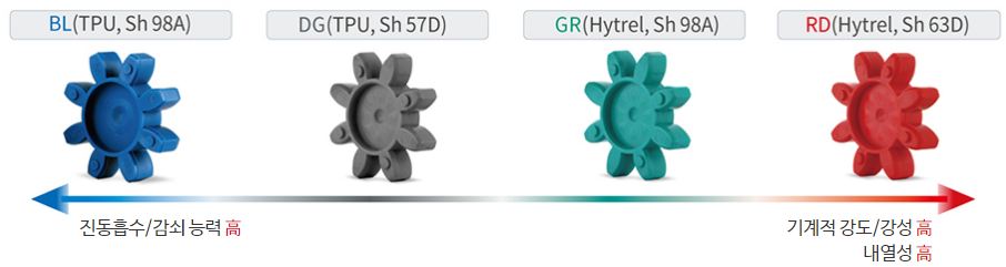 - 슬리브의 종류는 재질과 경도에 따라 RD(Hytrel, Sh 63D), GR(Hytrel, Sh 98A), DG(TPU, Sh 57D), BL(TPU, Sh 98A)로 나누어집니다.