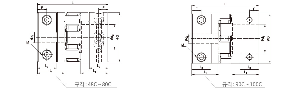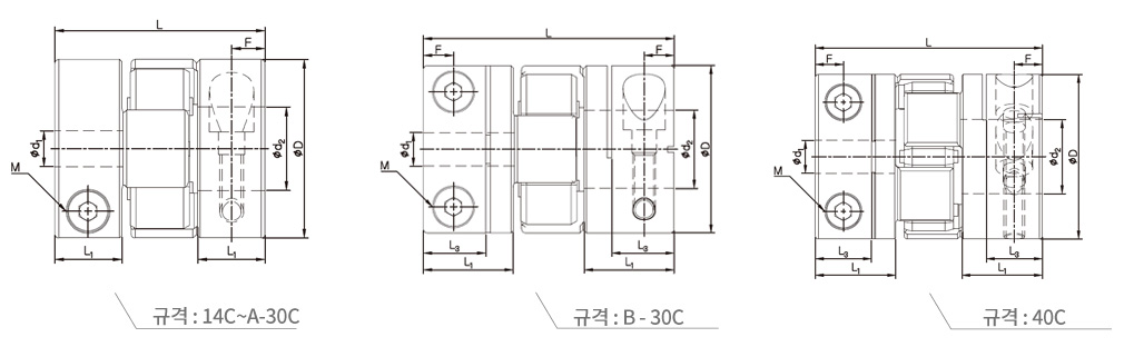 - 최대토크/상용토크는 커플링 자체 내구성과 관련된 값입니다. (축과 내경 구멍 사이에서 발생하는 슬립토크와는 무관합니다.)