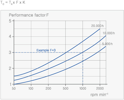 예를 들어 예상되는 사용 속도가 1000 rpm 이고 요구되는 수명이 10,000 시간일 경우 F=3 이 됩니다.
