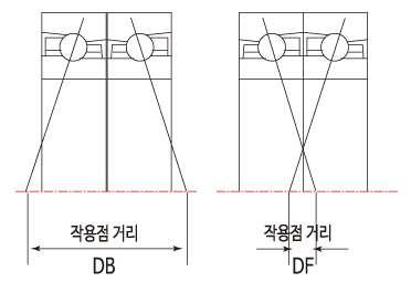 - 배면조합(DB) : 작용점의 거리가 길어 모멘트 하중이 작용하는 경우 강성이 높으나, 내부하중이 증가하여 조기 플레이킹 등의 손상이 일어나기 쉽다. 사용자가 로크너트를 잠글때 부여하는 토크에 따라 예압이 결정된다.