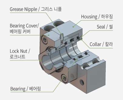 - 서포트 유니트의 베어링 커버에 그리스 주입이 가능한 니플과 그리스 이동 통로를 만들어 베어링에 그리스 주입이 가능한 구조임.