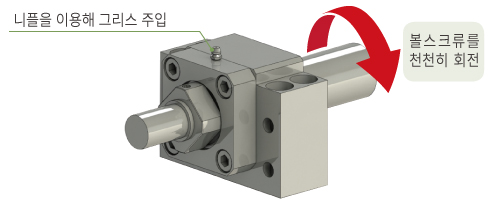 - 서포트 유니트가 설치된 상태에서 볼스크류를 천천히 회전시키며 그리스 니플을 통해 그리스를 서서히 주입해주세요.