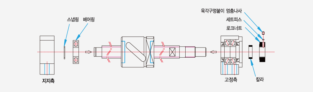 2. 지지측 볼베어링을 먼저 볼스크류 지지단에 조립한뒤 스냅링으로 고정하고 볼베어링을 지지측 하우징에 삽입한다.