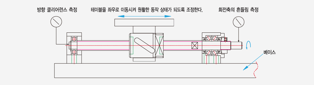 2. 볼스크류의 회전축 끝단에 대한 흔들림과 축방향에 대한 엔드플레이는 다이얼 게이지를 이용해 측정한다. 이를 측정하면서 너트브라켓과 테이블, 고정측 유니트와 베이스, 지지측 유니트와 베이스의 순서로 본 체결을 한다.