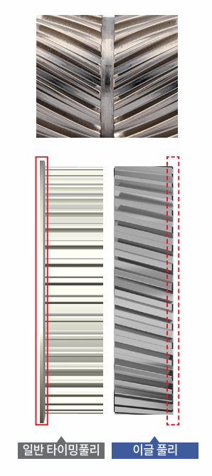 이글 타이밍 풀리 제품은 나선형 치형 설계가 적용된 제품입니다. 구동 시 벨트와 풀리 치형이 점진적, 연속적으로 맞물리는 특성을 갖습니다. 이러한 설계는 소음을 줄이고 마모를 최소화합니다. 또한, 진동을 줄여 다른 치형의 타이밍 풀리 (사다리꼴, 둥근 치형 등)에 비해 향상된 동력 전달 성능을 제공합니다.