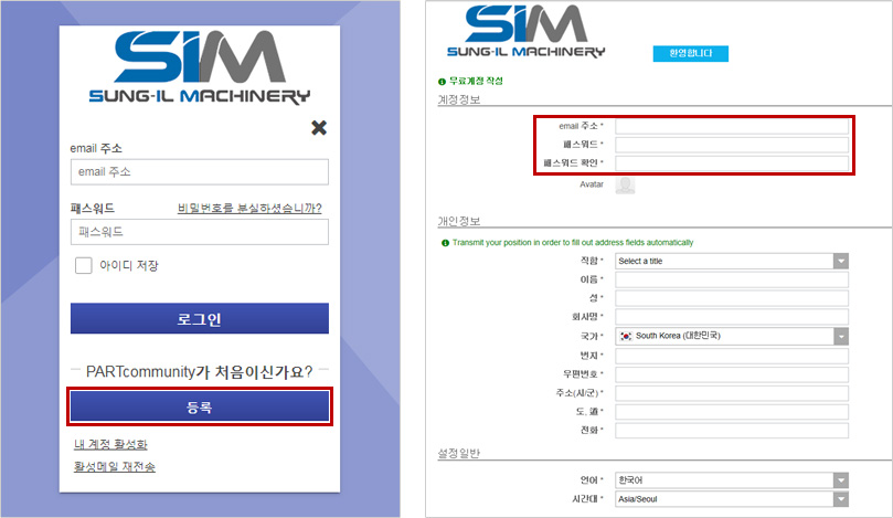 - 등록 버튼을 클릭하면 오른쪽과 같이 회원가입을 위한 화면으로 전환됩니다.