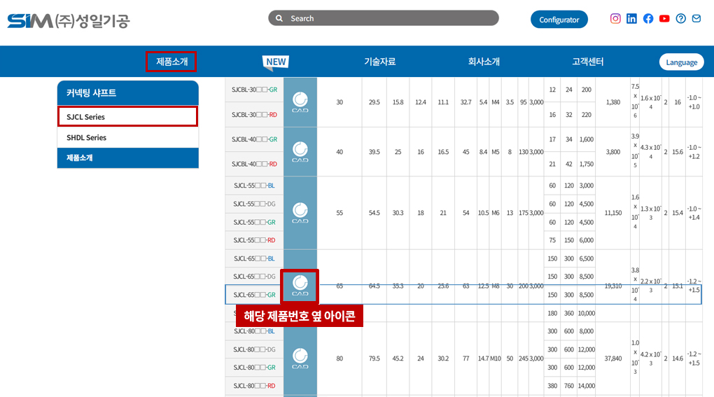 ㈜성일기공 웹사이트 맨 상단 메뉴 중 [제품 소개] >> [커넥팅 샤프트] >> [SJCL Series 혹은 SHDL Series] >> [규격/성능/CAD]
